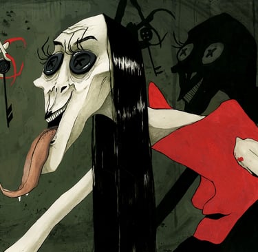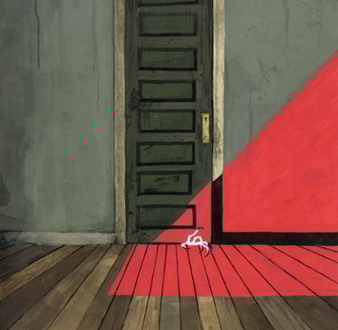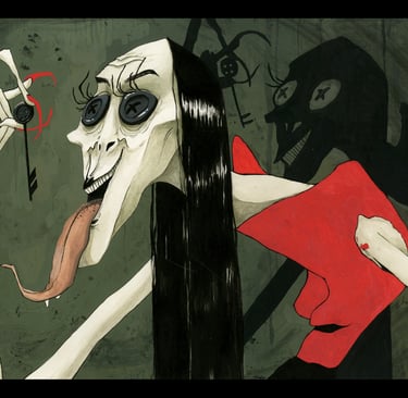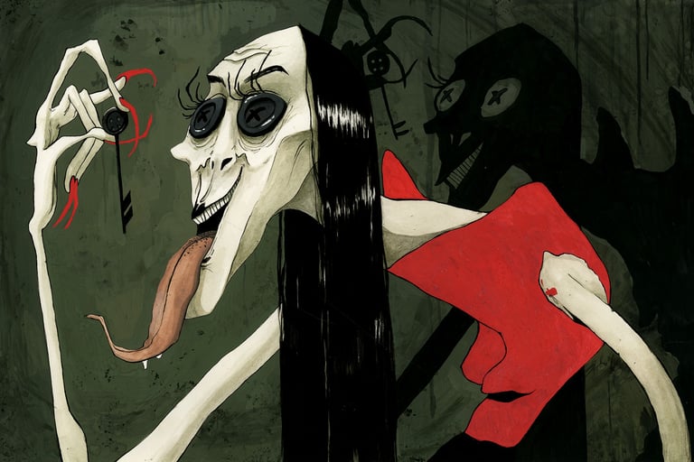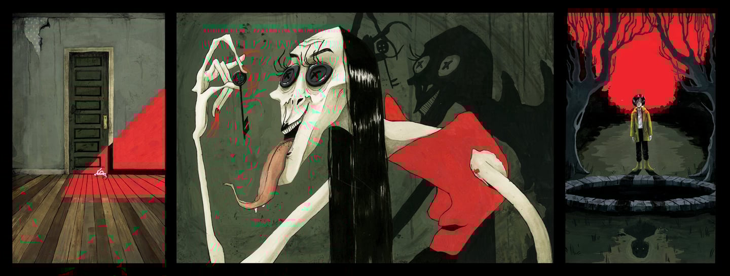 The Coraline triptych is a series of illustrations based on the book, Coraline. They were created using gouache, ink, Posca acrylic markers, and ink. The first image of the series, The Door, won a Society of Illustrators award.